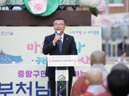 중랑구가 18일 저녁 중랑구민광장에서 불기2568년 부처님오신날을 맞이해 범종 점등식을 개최했다. 이날 점등식을 시작으로 범종(성덕대왕 신종, 국보 29호) 모형의 등은 5월 15일까지 약 한 달간 중랑구민