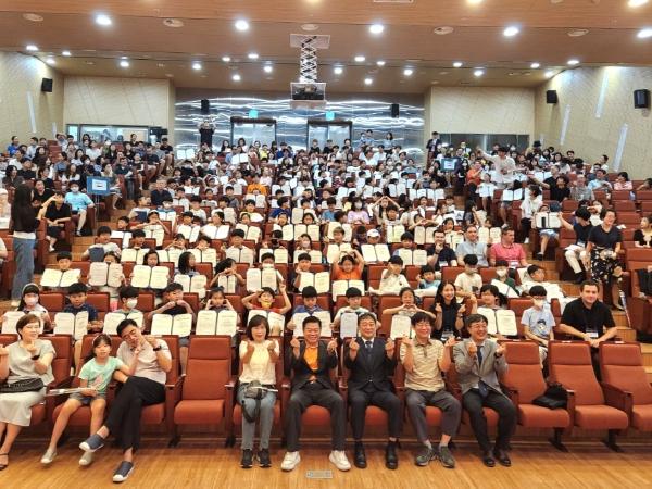 이번 영어체험교실은 관내 초등학교 3~6학년 학생을 대상으로 7월 31일부터 8월 12일까지 총 12일간 한국외대 서울캠퍼스에서 운영됐고, 지난 12일에는 프로그램을 수료한 학생들을 대상으로 여름방학 영어체험교실 수료식이 개최됐다.