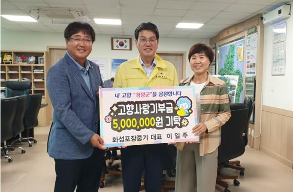 경기도 화성시에서 화성포장중기를 경영하는 이일주(사진 왼쪽) 대표이사가 지난 11일 부인과 함께 청양군을 방문해 고향사랑 기부금 500만 원을 전달했다.