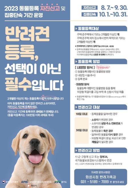 화성시가 9월 31일까지 반려견 소유자를 대상으로 ‘동물등록 자진신고 기간’을 운영한다.