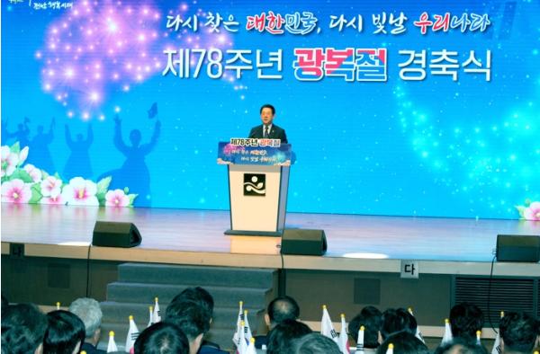 ‘다시 찾은 대한민국, 다시 빛날 우리나라’를 주제로 열린 경축식은 독립유공자 포상을 시작으로, 광복회 기념사, 경축사, 비슬무용단과 목포시립합창단 기념공연, 광복절 노래 제창, 만세삼창으로 진행됐다.