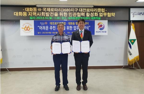 대전 대덕구 대화동과 국제로타리클럽3680지구 대전로타리클럽이 지역사회 상생발전을 위한 업무협약을 체결했다.