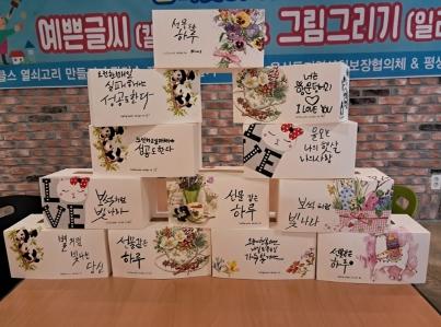 체험 교실에 참석한 12가구는 캘리그라피와 일러스트를 겸해 예쁜 글씨와 그림으로 슈링클스 열쇠고리와 곽티슈케이스를 만들며 즐거운 시간을 보냈다.
