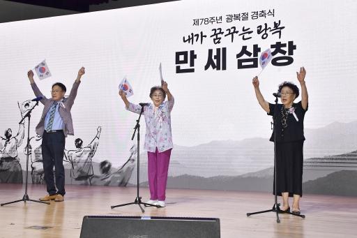제78주년 광복절을 맞은 15일 오전 10시50분. 경축식이 열린 광주광역시청 대회의실 가득 만세삼창이 울려퍼졌다. 이번 만세삼창의 선두에는 최만년 애국지사 손자녀인 최장훈 선생, 일제강제동원 피해자 양금덕 할머니, 김범수 독립유공자 손자녀인 김행자 선생이 함께 섰다.