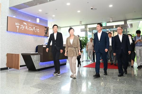 특히, 김장호 구미시장의 안내로 공간이 협소하여 모두 전시하지 못해 수장고에 보관돼 있는 유품을 둘러보며, "박정희 대통령의 지팡이와 육영수 여사가 사용하시던 2단 책상과 자개소품함 등을 보고 기억이 난다"며 부모님에 대한 애틋한 추억을 떠올렸다.