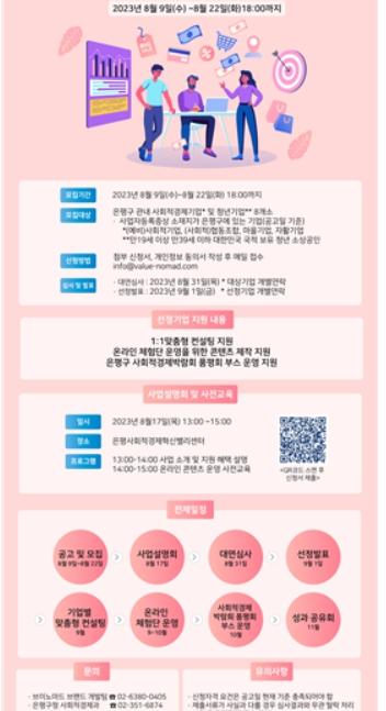 서울 은평구가 오는 22일까지 ‘2023년 사회적경제·청년기업 컨설팅 및 품평회 지원 사업’ 참여기업을 모집한다고 밝혔다.