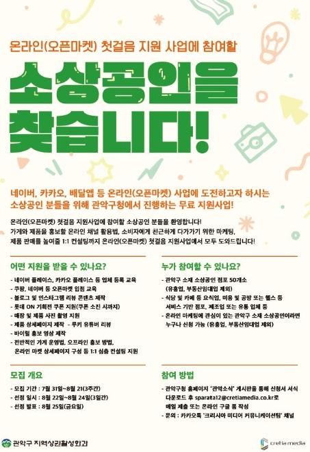 모집 기간은 오는 8월 21일까지이며, 모집 대상은 관악구에서 사업장을 운영하며 온라인 쇼핑몰에 입점을 희망하거나 마케팅에 어려움을 겪는 소상공인 점포 50개소이다.