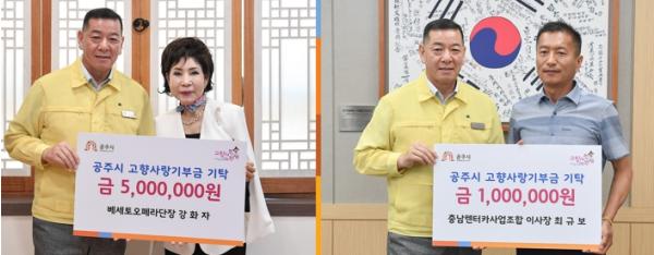 공주시는 지난 14일 출향인인 강화자 베세토오페라단장과 충남렌터카사업조합 최규보 이사장이 고향사랑기부금을 전달했다고 밝혔다.