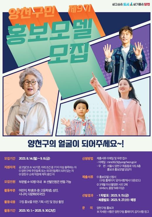 양천구는 구민이 직접 홍보활동에 참여하는 열린 행정으로 더욱 친근하게 구정 소식을 전달하기 위해 '제9기 양천구 홍보 모델'을 선발한다고 밝혔다.