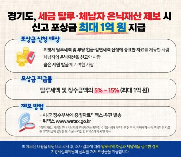 경기도가 탈세 신고포상금을 최대 1억 원까지 지급하는 ‘지방세 탈루 세액·체납자 은닉재산 민간인 신고포상제’를 시행하고 있다며 도민들의 관심과 제보를 요청했다.