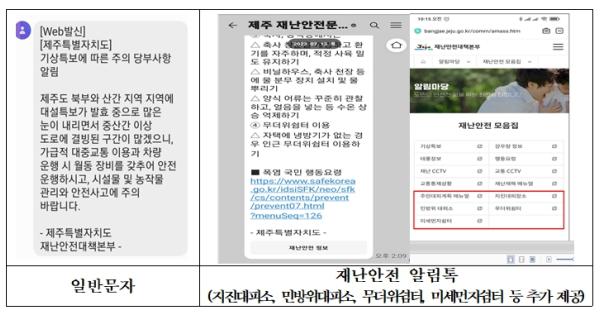 제주도는 당분간 재난문자와 알림톡을 병행해 도민에게 재난안전 정보를 전달하고, 앞으로 더욱 다양한 정보를 제공하기 위해 재난안전 알림톡 발송을 순차적으로 확대할 계획이다.