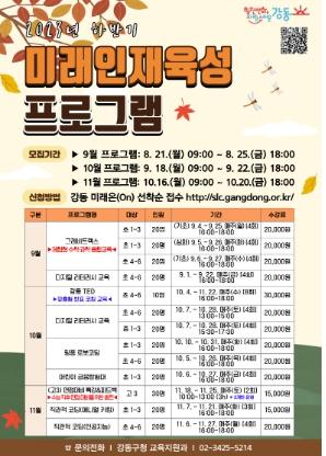9월 프로그램 수강 신청은 오는 25일까지 통합교육포털 강동 미래온(ON)에서 가능하며, 자세한 내용은 강동구청 교육지원과에서 안내받을 수 있다.