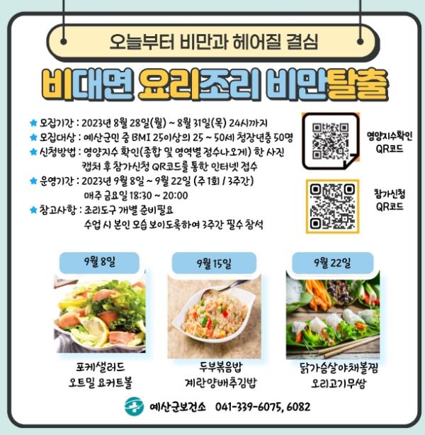 예산군보건소는 청장년층 비만 유병률의 증가 및 비만 합병증으로 고혈압, 당뇨병 등 만성질환 유병률이 높아짐에 따라 청장년층의 영양 문제를 개선하고자 올해 신규 프로그램으로 ‘요리조리 비만탈출 요리교실’을 운영한다.