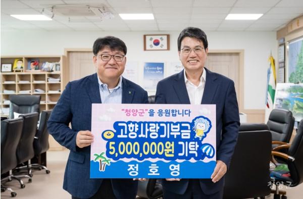 지난 6월 14일 청양군을 방문해 500만 원을 전달한 정 대표는 고향 청소년들이 끼와 열정을 발휘하는 데 보탬이 되도록 답례품으로 받은 청양사랑상품권(150만 원)을 청양군청소년재단(이사장 이종필)에 맡겼다.