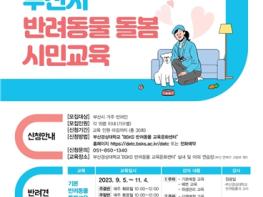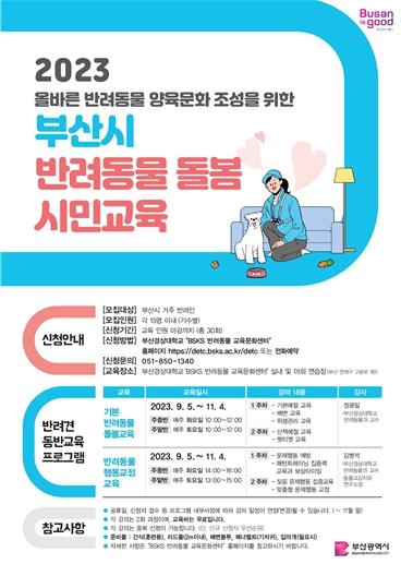 부산시는 오는 9월 5일부터 11월 4일까지 부산경상대학교 반려동물교육문화센터에서 ‘2023 부산시 반려동물 돌봄 시민교육’을 운영한다고 밝혔다.