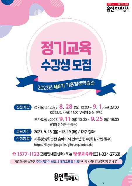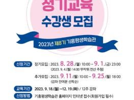 용인특례시 기흥평생학습관은 오는 28일부터 다음달 1일까지 ‘제8기 정기교육 수강생’ 505명을 모집한다고 25일 밝혔다.