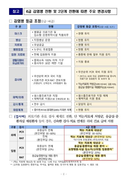 현재 운영 중인 선별진료소는 60세 이상과 감염취약시설 종사자 등 고위험군 대상으로 하는 무료 검사를 당분간 유지한다. 또한 기준중위소득 100%이하 가구의 확진자에게 주는 생활지원비, 코로나19로 격리 입원한 근로자에게 유급 휴가를 제공한 기업에 주는 유급 휴가비는 31일부터 중단되나, 병원급 의료기관과 입소형 감염취약시설에서의 마스크 착용 의무는 당분간 유지된다.