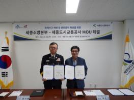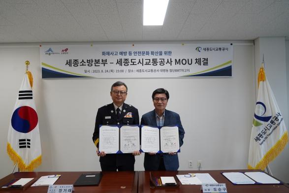 세종소방본부가 세종도시교통공사와 지난 24일 대평동 첨단비알티(간선급행버스체계, BRT)차고지에서 안전문화 확산을 위한 업무협약을 체결했다.