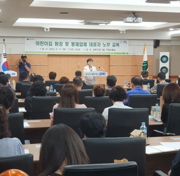 서울 강북구는 지난 17일 어린이집 원장 및 봉제업체 대표 자 50여명이 참석한 가운데 노무교육을 실시했다.