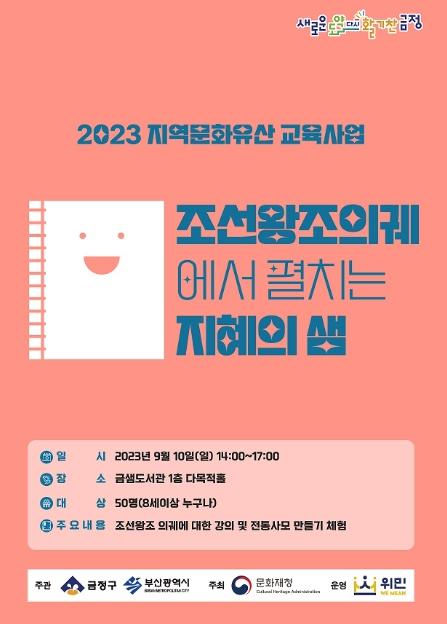 부산 금정구는 2023년 지역문화유산 교육사업인 ‘K-story(고전) 조선왕조의궤에서 펼치는 지혜의 샘’ 참가자를 오는 8월 29일부터 8월 31일까지 금정구청 홈페이지에서 모집한다.