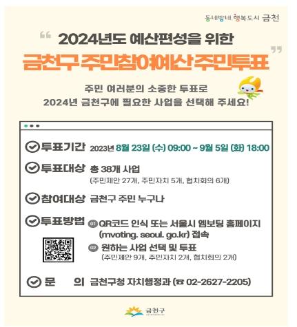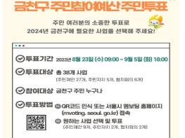 금천구는 9월 5일까지 2024년도 주민참여예산 사업 선정을 위한 주민투표를 실시한다고 밝혔다.