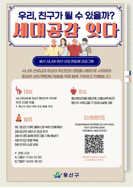 세대공감 1일 프로그램은 9월 21일 오후 3~5시에 시립용산노인종합복지관에서 열린다. 앞서 2개 프로그램에 참여했던 청년·어르신 120명이 한데 모여 레크리에이션, 커뮤니티 댄스 등을 즐긴다.