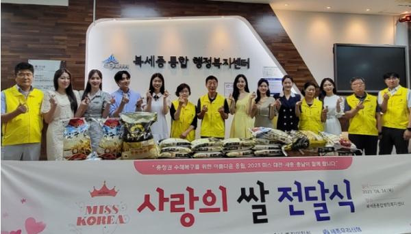명인엔터테이먼트, 2023 미스 대전세종충남 조직위원회, 세종우리신협, 행복라이언스클럽은 지난 24일 조치원읍지역사회보장협의체에 수해 이재민들을 위해 사용해달라며 쌀을 전달했다.