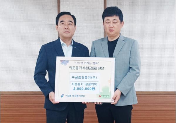 용인특례시 기흥구 구성동은 ㈜구성토건중기가 지난 24일 어려운 이웃을 위해 써달라며 성금 200만원을 기탁했다고 25일 밝혔다.