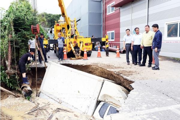 김경일 파주시장은, 싱크홀(땅 꺼짐) 현장에서 복구 현황을 점검하며 추가 피해를 예방하기 위한 안전 강화 대책을 논의했다.