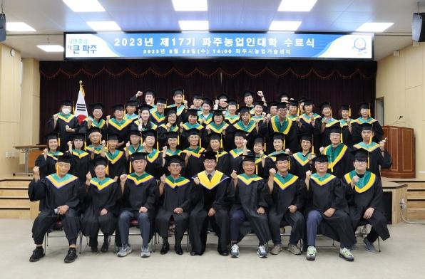 파주시는 23일 파주농업기술센터 농업과학교육관 3층 교육장에서 2023년 제17기 파주농업인대학 수료식을 개최하고 59명의 교육 수료생을 배출했다.