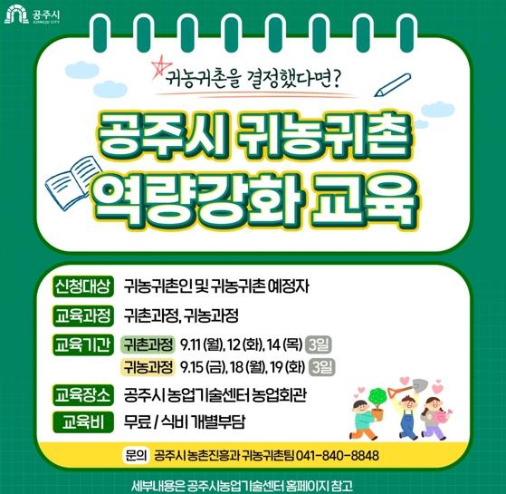 공주시는 오는 9월 6일까지 하반기 귀농귀촌인 역량 강화 교육 대상자 50명을 모집한다고 25일 밝혔다.
