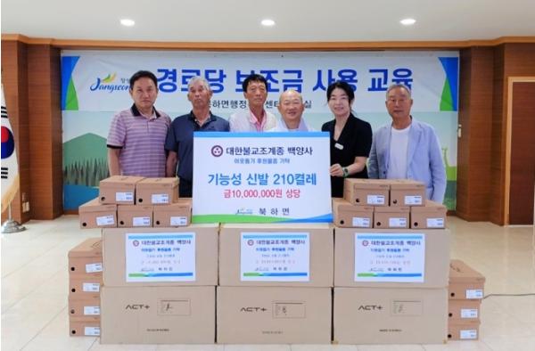 장성군 백양사가 24일 북하면 행정복지센터 경로당에서 열린 보조금 정산교육에 앞서 신발 210켤레(1000만 원 상당)를 기탁했다. 기탁품은 근육 이완, 긴장 완화, 발 교정 등에 도움을 주는 기능성 신발이다.
