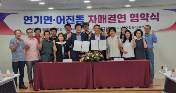 지난 25일 어진동주민센터 다목적강당에서는 김윤희 어진동장과 이진례 연기면장, 양 협의회 및 관계자 10여 명이 참석한 가운데, 어진동 통장협의회와 연기면 이장협의회가 자매의 연을 맺었다.