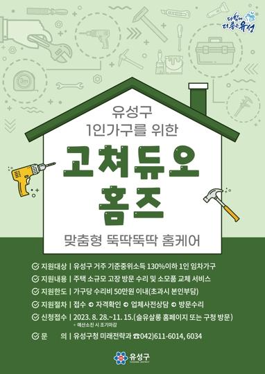 대전 유성구는 1인 가구의 쾌적하고 편리한 주거생활을 지원하기 위해 ‘맞춤형 뚝딱뚝딱 홈케어 고쳐듀오 홈즈’ 사업을 추진한다고 밝혔다.