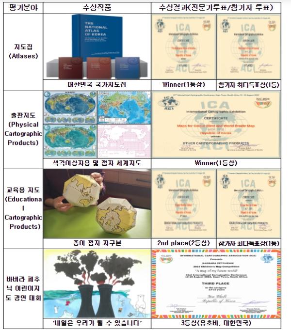 우리나라는 지도집(Atlases) 분야*에 출품한 ‘대한민국 국가지도집’과 출판지도(Physical Cartographic Products) 분야에 출품한 ‘색각이상자용 및 점자 세계지도’ 가 1등상으로 선정되면서 2관왕을 달성했으며, 교육용 지도(Educational Cartographic Products) 분야에 출품한 ‘종이 점자 지구본’이 2등상 수상작으로 선정됐다.