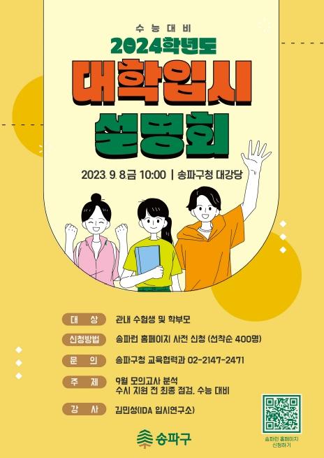 송파구가 이른바 ‘킬러 문항’ 배제 등 급변하는 입시환경에 대비하여 ‘2024 수능대비 대학입시설명회’를 개최한다.