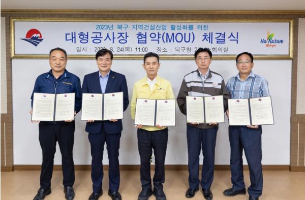 부산 북구는 지난 24일 북구청 소회의실에서 대한전문건설협회 부산광역시회, 관내 대형공사장 시공사인 ㈜한화·엘리종합건설㈜·㈜고려엔지니어링종합건설과 3자간 건축공사 지역건설업체 참여 활성화를 위한 양해각서(MOU)를 체결했다.