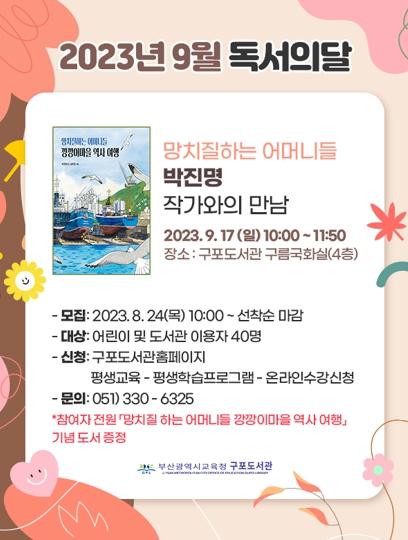 부산광역시립구포도서관은 독서의 달을 맞아 오는 9월 17일 오전 10시 도서관 구름국화실에서 ‘망치질하는 어머니들’을 집필한 박진명 작가와의 만남 행사를 갖는다.
