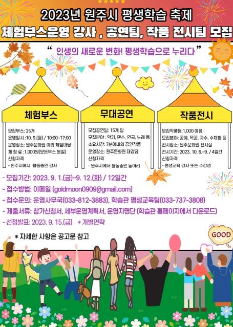 원주시 평생교육원 학습관은 ‘인생의 새로운 변화! 평생학습으로 누리다!’라는 주제로 10월 9일 개최되는 2023년 원주시 평생학습 축제 참가팀을 모집한다.