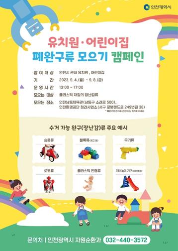 인천광역시는 2023년 제15회 자원순환의 날(9월 6일)을 맞아 9월 4일(월)부터 9월 8일(금)까지 유치원과 어린이집을 대상으로 폐완구류 모으기 캠페인을 추진한다고 밝혔다.