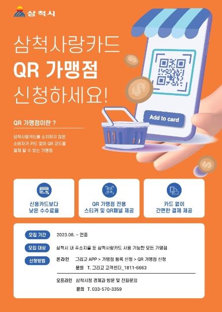 QR결제 서비스 등록대상은 삼척사랑카드 가맹점 중 개인사업자이며, 법인사업자와 연매출액 30억 초과 가맹점은 제외이다. QR결제 서비스 가맹점 등록을 희망하는 개인사업자는 ‘그리고’ 모바일 앱이나 인터넷 온라인을 통해 신청하거나 시청 경제과로 방문하면 되고, 가입 시 QR결제 키트가 무료로 지원된다.