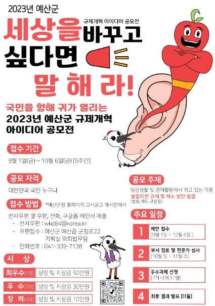 예산군은 국민의 일상생활과 기업의 경제활동에서 겪는 불합리한 규제 등을 발굴·개선하기 위해 ‘2023년 규제개혁 아이디어 공모전’을 개최한다.