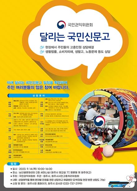 국민권익위원회가 주최하고 원주시와 원주시시민고충처리위원회가 주관하는 '원주지역 달리는 국민신문고'가 오는 14일 오전 10시부터 오후 4시까지 명륜동 남산골문화센터(구 원주여고) 2층에서 개최된다.