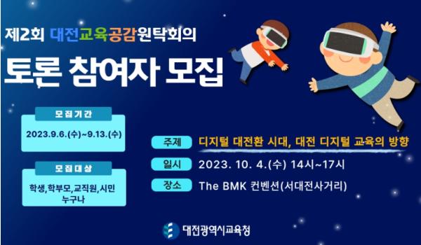 대전광역시교육청은 10월 4일 오후 2시에 더 BMK 컨벤션에서 ‘디지털 대전환 시대, 대전 디지털 교육의 방향’이라는 주제로 개최되는 '2023년 제2회 대전교육공감원탁회의'에 참여할 토론참여자를 모집한다고 밝혔다.