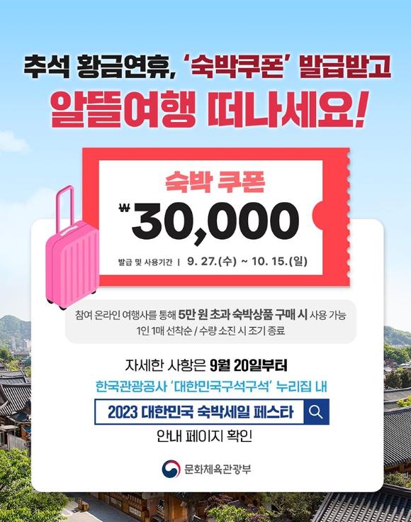 “무려 엿새나 되는 추석 황금연휴, ‘숙박쿠폰’ 발급받고 알뜰 여행 떠나세요!”