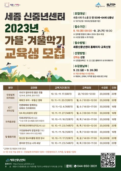 세종특별자치시가 세종신중년센터 가을·겨울학기 교육에 참여할 수강생을 19일부터 21일까지 모집한다.