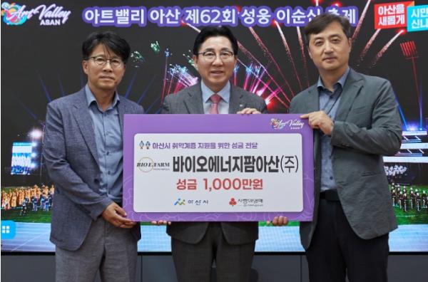 바이오에너지팜아산(주)는 2023년 9월 5일(화) 아산시를 방문하여 취약계층 지원을 위한 성금 1,000만 원을 전달했다.