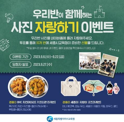 세종특별자치시교육청은 학급의 다양한 이야기를 공유하고 공감하는 계기 등을 마련하고자 ‘우리반이 함께하는 사진 자랑하기 이벤트’를 실시한다.