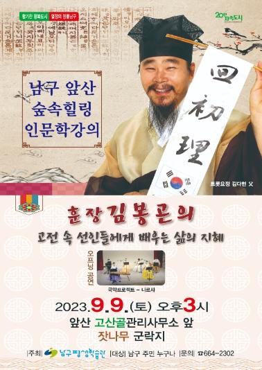 이날 강연에서는 트롯요정 ‘김다현’의 아버지로 잘 알려진 신선마을 선촌서당 훈장 김봉곤씨를 초청해 ‘고전 속 선인들에게 배우는 삶의 지혜‘라는 주제로 과거의 선인들에게서 삶의 지혜를 배워 현재를 어떻게 살아가야 하는지에 대해 강의할 예정이다.