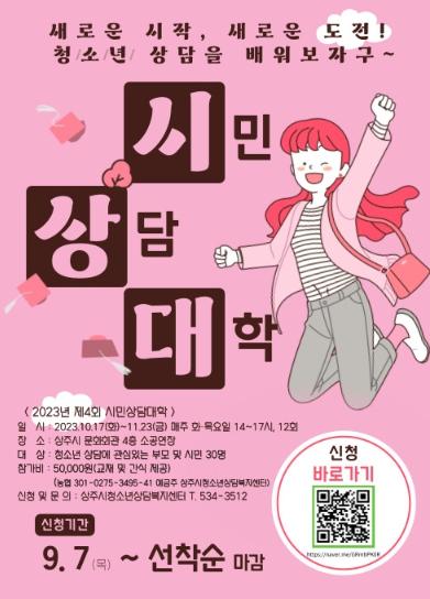 상주시청소년상담복지센터는 10월 6일까지 2023년 제4회 시민상담대학 교육신청자 30명을 선착순으로 모집한다.